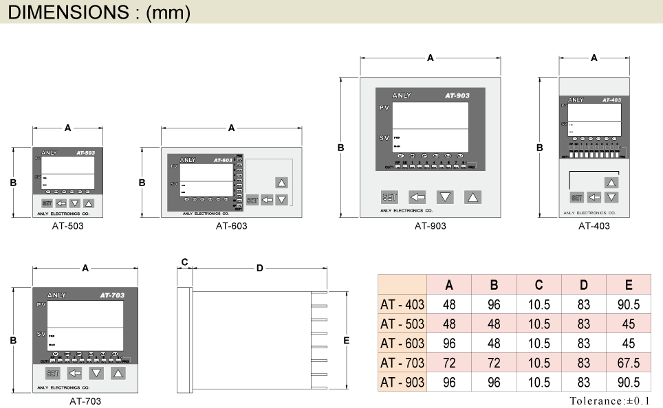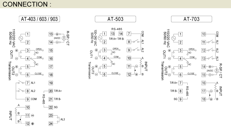 Prev Temperature Controller Temperature Controller AT03 PID TEMPERATURE CONTROLLER Add to inquiry Inquiry list Description Wiring and timing diagrams Overall dimensions or other Download Up to 2 output and 3 alarm channels Servo motor control possible 4 PID levels For heating and cooling processes Thermocouple, RTD and linear inputs Separate input channel for Remote Set Point Optional RS-232 or RS-485 communication Available in 5 sizes : 48 x 48mm(1/16DIN), 48 x 96mm(1/16DIN), 72 x 72mm, 96 x 48mm, 96 x 96mm(1/4DIN) AT03 Catalogue AT03 Users Manual